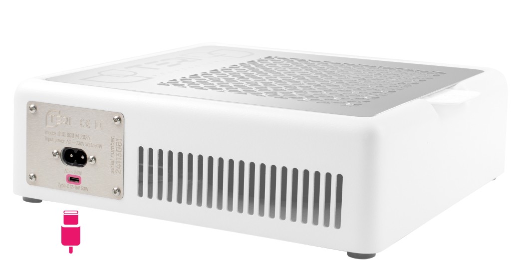 Teri 600 M — це портативний пиловловлювач, розроблений разом із майстрами манікюру та школами манікюру. Він оснащений водостійким HEPA-фільтром, який можна мити та дезінфікувати. Знімна металева сітка на магнітах забезпечує легке очищення.